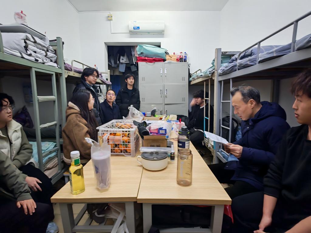 走访过程中,周明华与同学们亲切交谈,详细询问大家日常学习进度、生活起居状况以及考研、就业等未来规划,认真倾听同学们在学业提升、校园生活中遇到的疑问与诉求。看到宿舍内务整洁、氛围融洽,周明华给予充分肯定,同时叮嘱同学们要始终保持良好生活习惯,注重宿舍环境卫生,互帮互助营造和谐友爱的集体氛围。