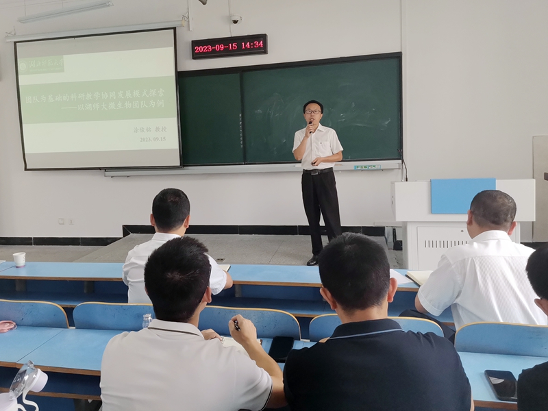 9月15日下午,湖北师范老员工命科学学院副经理涂俊铭教授应邀来公司做题为《团队为基础的科研教学协同发展模式探索——以湖师大微生物团队为例》的学术报告。化学与环境工程公司领导及生物科学专业师生等100余人参加会议,报告会由王锋尖教授主持。