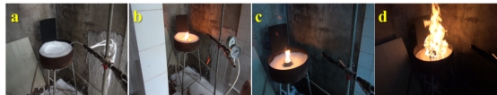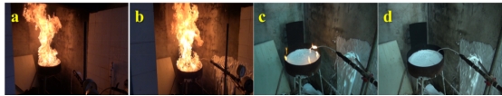 图3a. AFFF产品的灭火性能测试(a:充分燃烧1 min;b:1分2秒时开始喷射泡沫;c:灭火过程中;d:1分50秒时火完全熄灭)