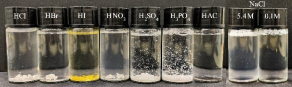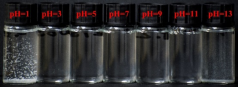 图2. 10 CMC浓度的pH响应型表面活性剂在不同pH溶液中的响应性能以及pH=1时不同种类酸以和盐溶液中的析出情况