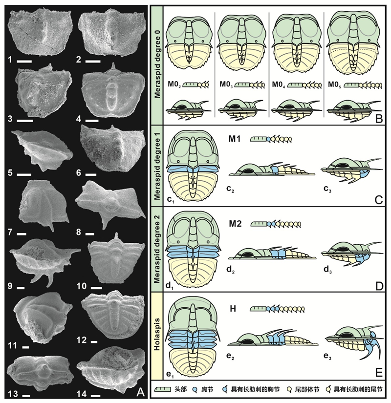 三叶虫作为研究节肢动物变态发育的典型代表,在寒武纪早期具有形态分异度高、演化速率快、躯干分化显著以及身体分异明显等特点,可以反映节肢动物在发育及演化等方面的特性及规律。作为寒武纪早期三叶虫的典型代表,古盘虫类三叶虫属于球接子目的一个亚目,是最早出现的三叶虫类群之一,仅发现于寒武系第三阶至第五阶(乌溜阶)。古盘虫亚目,包含50多个属,是三叶虫纲中一个形态独特的类群。